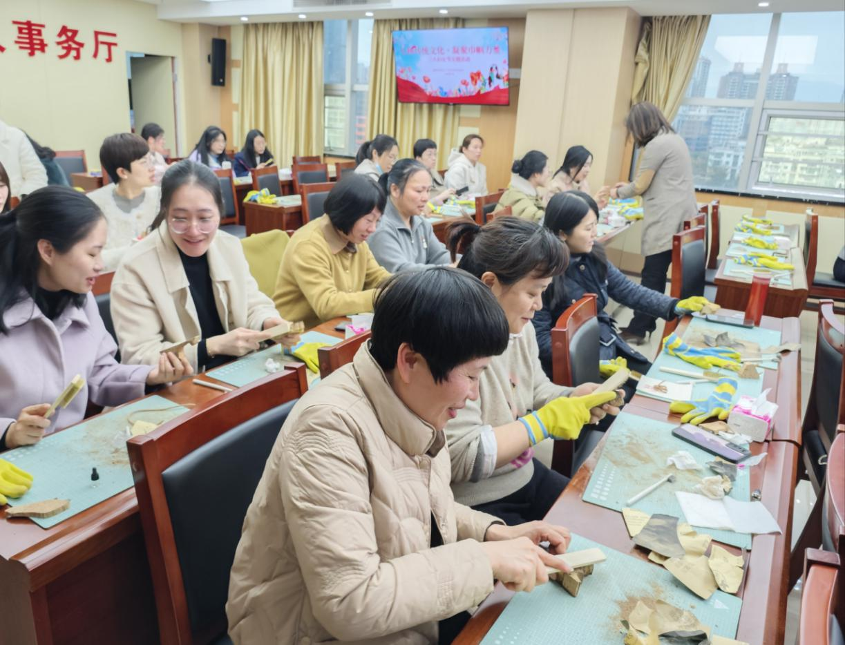 活动现场,软木画专家对国家非物质文化遗产——福州“三绝”之一的软木画的文化、历史及制作技艺进行授课,随后,全体女干部职工们在专家的指导下,一边聆听非遗文化,一边认真打磨,在方寸间感受手造福州软木画魅力和传统文化的博大精深,在沉浸式体验软木康养梳和扩香器的制作中,探寻一块木头如何变成一幅绚丽的“无声的诗,立体的画”。