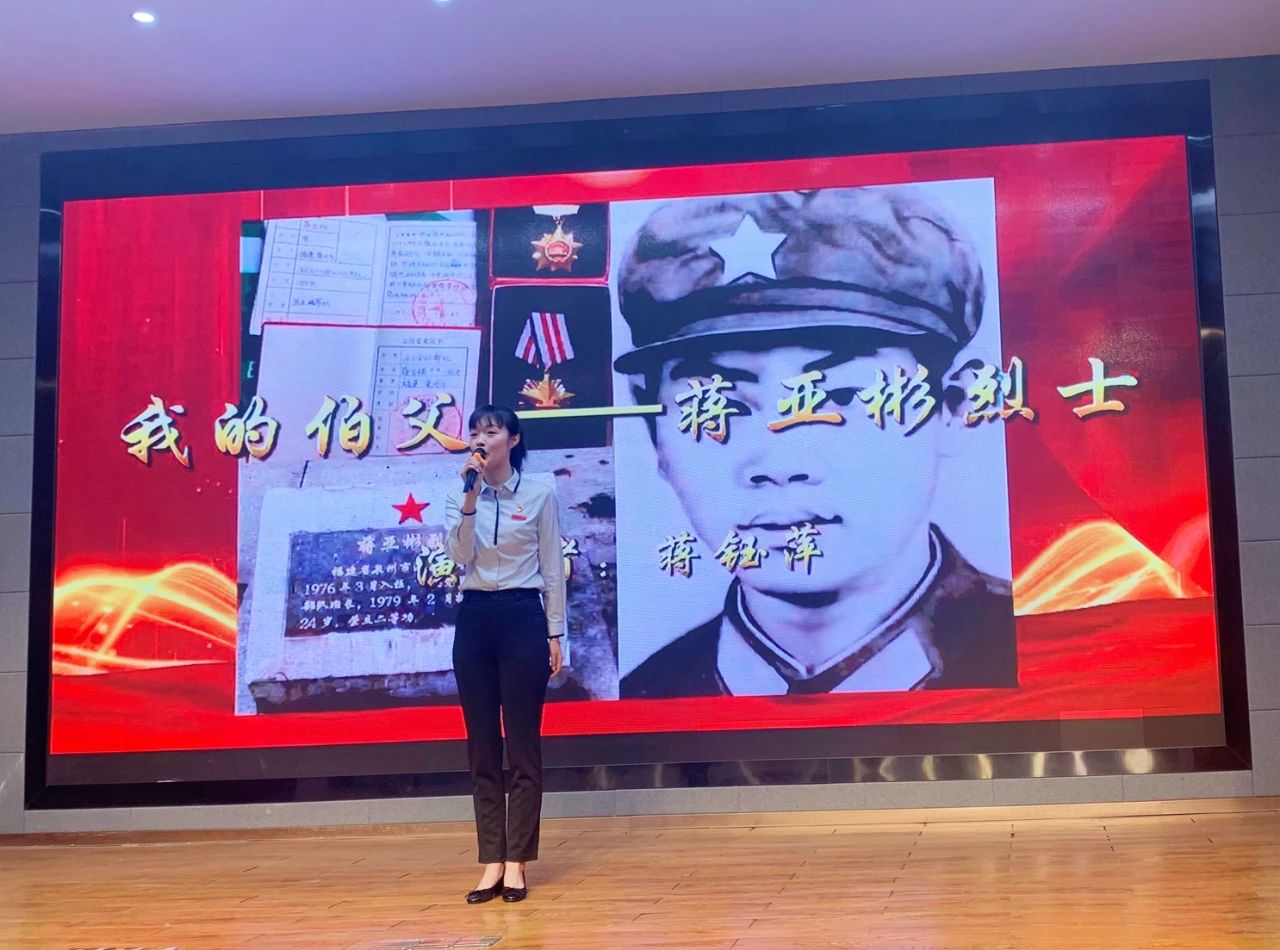 宣讲活动由福建省“烈士亲友讲烈士故事”巡回宣讲团成员、鲤城籍烈士蒋亚彬的侄女蒋钰萍,饱含深情地讲述了《我的伯父——蒋亚彬烈士》。44年前一个风华正茂的热血青年,为了国家和民族的利益,不顾个人安危,英勇作战,身负重伤仍坚守阵地,胜利完成任务却献出年轻的生命,从此长眠在了祖国的南疆。宣讲员蒋钰萍用铿锵的话语讲述蒋亚彬烈士在对敌作战中英勇顽强和不畏牺牲的精神,讲述他带给亲人带给后人的榜样力量。 鲜活的烈士事迹、娓娓道来的叙述、饱含思念的泪水,诠释着“你记得我,我就活着”的温度和力量。现场学生在聆听事迹后深受感染、倍受振奋,纷纷表示将铭记历史征程,以英烈为榜样,心存感恩,牢记使命,砥砺前行,为实现中华民族伟大复兴的中国梦贡献青春力量。