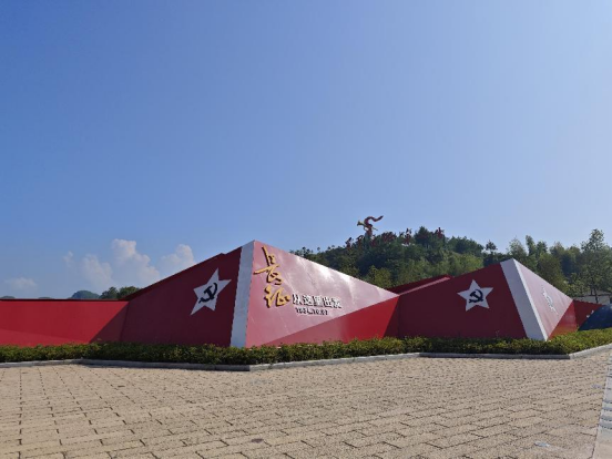 凤凰山村长征历史步道。 记者 王挺 摄 “我们现在所在的是情忆园广场,它有三个红色元素。第一个是眼前的旗阵,它由四面八方的红旗汇合而成,象征着四面八方的红军汇集到这里;第二个是远处的‘万里长征第一步’7个大字;第三个是远处的‘军号嘹亮’雕塑,这个雕塑高19.34米,象征着1934年一声号角之下,上万名中央红军从这迈出了万里长征的第一步。”在凤凰山村,讲解员向大家介绍村口广场布置内含的深意。
