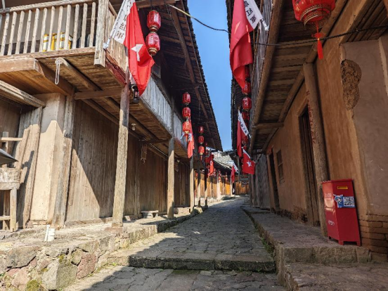 采访调研团走进红军街。 记者 王挺 摄 “红军买卖公平,纪律严明,不随意打扰群众,赢得了人们的认可和敬佩。当地村民便主动将自家祠堂、祖屋让出来,供红军居住和休整。当年,这条街道上家家户户的屋檐下都住满了红军,村民甚至把自家门板拆下来,给红军战士当床睡。因而村民也亲切地称这里‘红军街’。”在村子里的红军街,讲解员对大家说。 红军街长约一千米,宽三四米,街道由石块铺就,街道两旁排列着土木结构的传统两层建筑。如今,这里已经修葺,历史更好地得以保留。