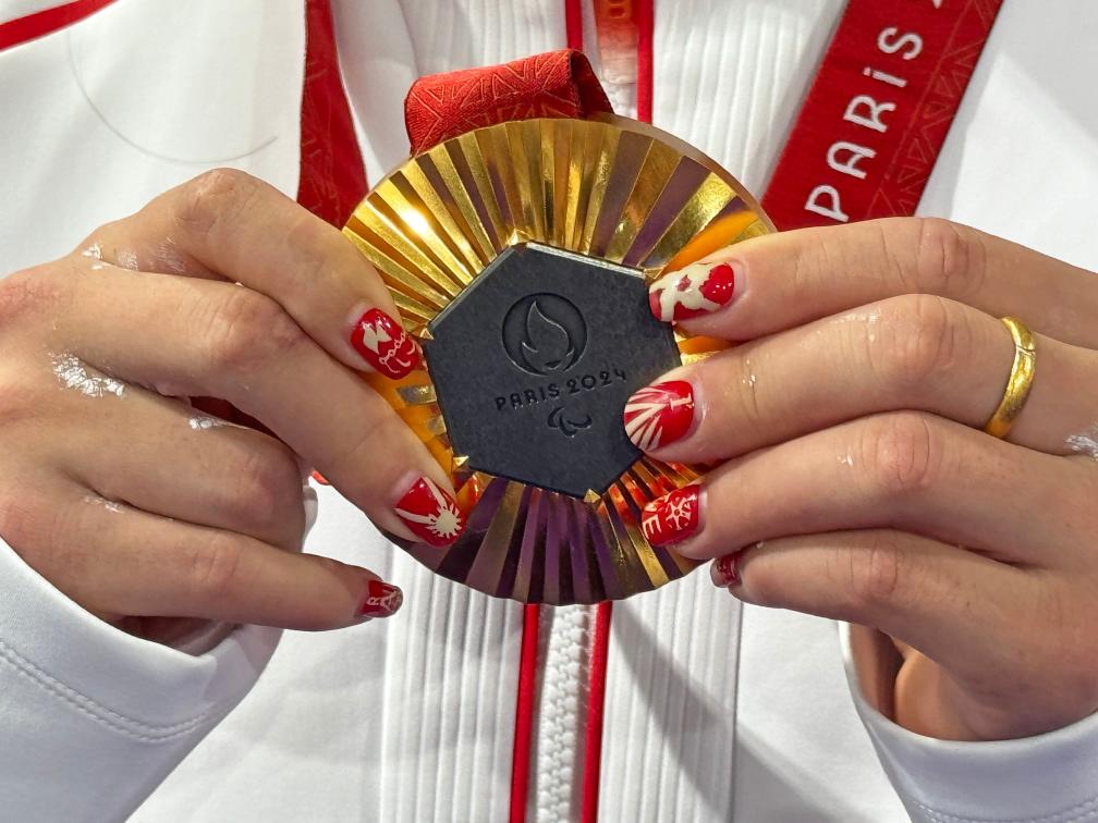 新华社巴黎9月4日电(记者胡佳丽、马思嘉)“美甲是我专门设计的,你看图案有国旗、自行车、第一名、埃菲尔铁塔、残奥会会徽……我觉得它很完美,因为我非常期待残奥会,想在残奥会上展示最美的自己,现在也如愿拿到了冠军!” 8月29日,中国选手王小梅连续打破世界纪录,夺得场地自行车女子C1-3级3000米个人追逐赛冠军。颁奖仪式后,她向记者展示了她为残奥会设计的美甲款式:以中国红作为底色,每个指甲上手绘的精美图案诉说着她的残奥梦想——突破自我、为国争光。 8月29日,王小梅展示自己的金牌。新华社记者 胡佳丽 摄 “出发前我还专门做了头发和睫毛,想着在残奥会的舞台上展示最美的自己。”王小梅在领奖前给自己补了个妆,把马尾辫梳得高高的,很精神。 “非常激动和开心,从比赛结束到现在我一直都很兴奋。没有想到能破世界纪录,可能因为对手很强大,一直在激励着我骑得更快;也因为这是残奥会的舞台,四年一次,大家都非常珍惜。”她说。 王小梅的队友钱王伟两次打破世界纪录,在女子C1-3级500米个人计时赛中摘银。来到巴黎后,她在残奥村做了自己喜欢的美甲。“翻译帮我和美甲师沟通的,这上面有我们中国的国旗、国宝熊猫、奥运的标志和当地的标志性建筑(埃菲尔铁塔)。”