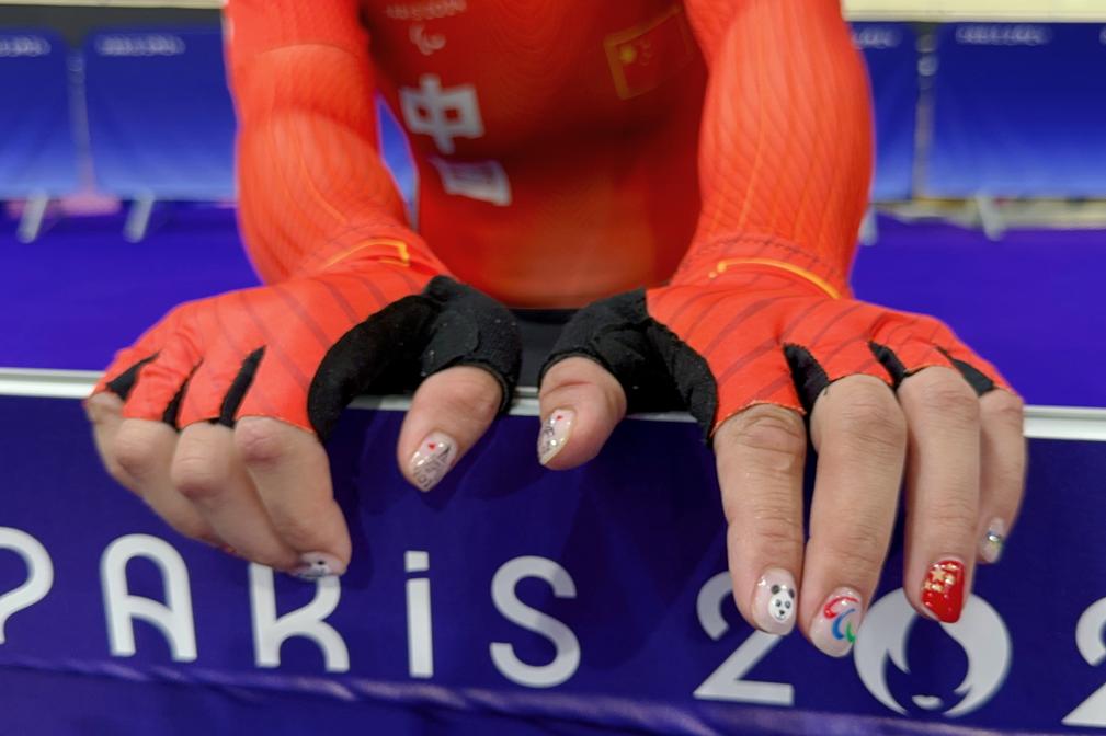 卢冬的美甲。新华社记者 郑直 摄 3日,卫冕冠军卢冬和队友何聖羔、刘玉为中国队横扫女子50米仰泳S5级金银铜牌,让三面五星红旗同时在拉德芳斯体育馆升起。“这边是一个金牌,希望给自己带来运气吧,因为金牌是我们运动员的梦想。这次拿到了金牌,我又开启了新的梦想,就是在下一届残奥会拿金牌。” |