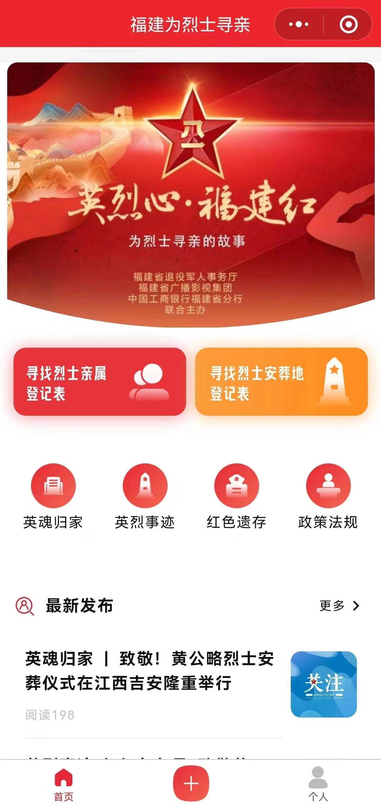 “福建为烈士寻亲”小程序 “福建为烈士寻亲”小程序的上线是福建省退役军人事务厅、省广播影视集团、中国工商银行福建省分行联合开展的“英烈心·福建红——为烈士寻亲的故事”主题系列宣传活动的重要环节。活动开展以来,先后在福建省电视台综合频道展播《山河无恙英雄归家》为烈士寻亲故事,目前已播出2集,分别讲述了为宁德籍烈士蔡威、漳州籍烈士昌丰泗寻亲的故事,以及两位烈士英勇战斗、为国牺牲的故事。下一步,还将继续播出寻亲系列故事,并推出《夜空中最亮的星——致敬英烈》专题宣传片。 烈士为国牺牲,我们帮烈士圆梦,既是对烈属的抚慰,也是对英雄烈士最好的缅怀与尊崇。请社会各界积极参与提供寻亲线索和信息,让我们一起带英雄回家。 |