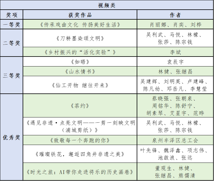 非遗舞蹈表演《三条簪》 颁奖活动现场,特色非遗舞蹈表演《三条簪》、闽南语歌曲《南北大街》等文艺节目,为观众带来了一场视听盛宴。同时,现场还展出了摄影类优秀作品,让观众近距离感受福建文化的独特魅力。 本次活动由中共福建省委宣传部指导,福建日报社(报业集团)、福建省文学艺术界联合会主办,东南网承办。福建日报社(报业集团)、福建省文联、省音乐家协会、省摄影家协会、省电视艺术家协会、文创相关企业以及获奖嘉宾、媒体记者等相关人员莅临现场,共同见证这一荣耀时刻。 获奖名单
