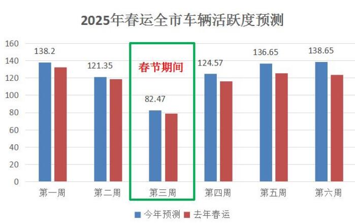 春运期间全市车辆活跃度 总体上来看,车辆活跃度趋势与往年基本一致,从农历腊月十五(1月14日)开始,车辆活跃度开始出现小幅度下降,并在腊月廿三(1月22日)开始大幅下降,除夕当天(1月28日)达到最低值,春节期间活跃度保持低位,车辆活跃度在正月初八(2月5日)以后才逐渐回升。