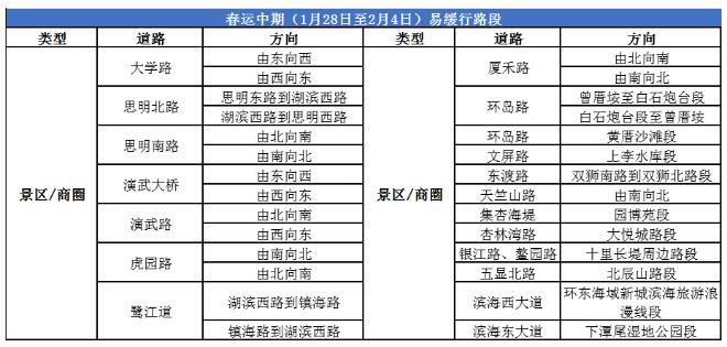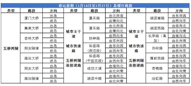 由于春节的特殊性,与其他节假日假期前相比,春运前期无明显的去程高峰,预测对城市交通无明显影响,同时随着春节临近,车流量将不断减少,车辆缓行情况将持续缓解。春节前车流量聚集路段主要仍集中在进出岛“五桥两隧”及其连接道路、城市快速路、城市主干道等道路。 春运中期(1月28日至2月4日)易出现缓行路段