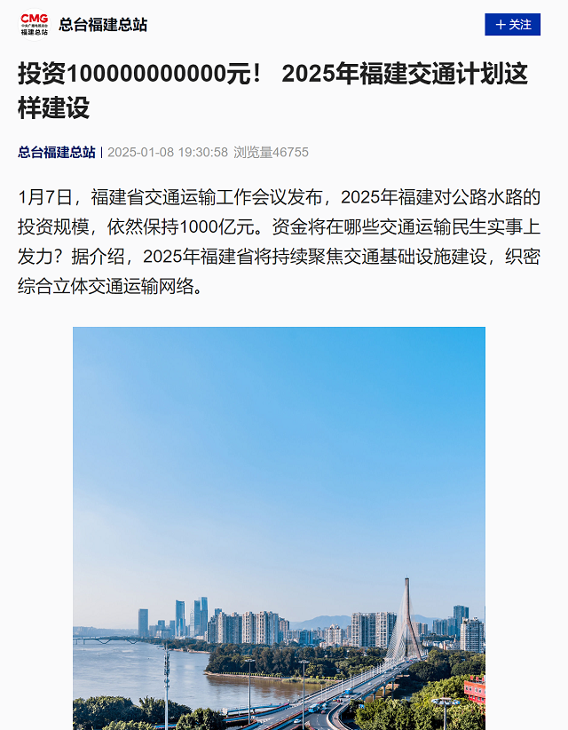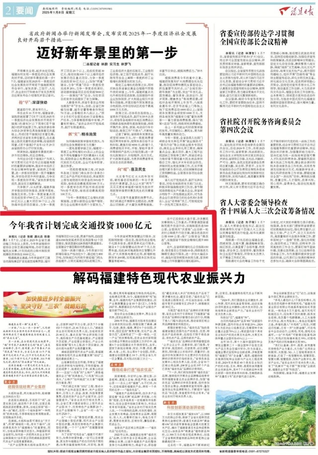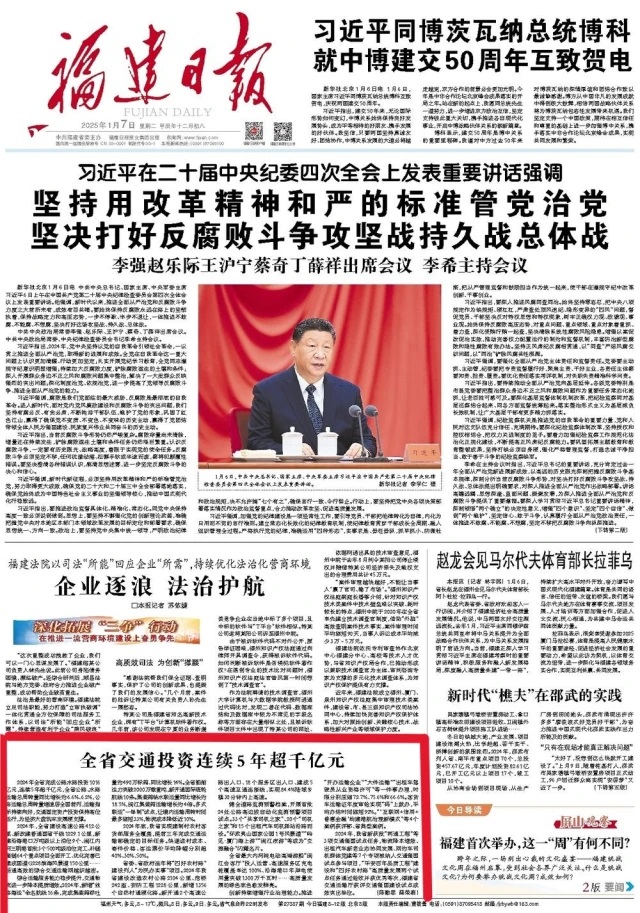 1月7日,2025年全省交通运输工作会议召开。《连续5年超千亿元:福建省交通投资保持高位运行》《福建交通今年计划完成投资1000亿元》在新华网、人民日报、央视网、央广网、学习强国、中国经济网、海峡网、福建日报、齐鲁晚报等媒体报道。各大媒体全方位介绍省交通运输厅在2024年为经济大盘筑牢发展硬支撑的成就,并聚焦我省2025年交通运输工作计划。 福建电视台