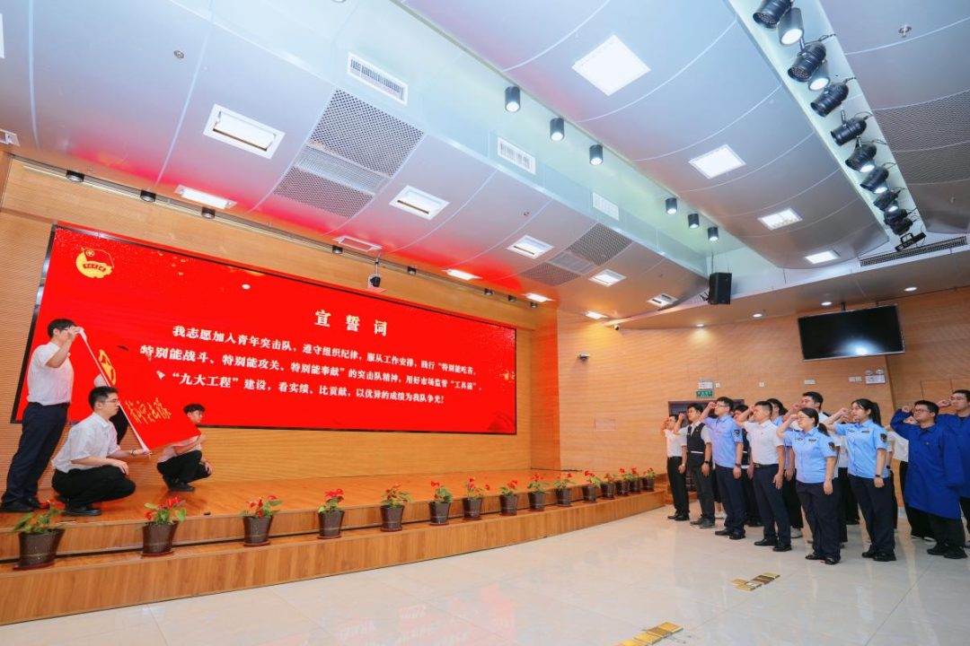 青年突击队队员们庄严宣誓,以铿锵有力的誓言,表达了坚决完成任务的决心和信心,展现出新时代市场监管青年挺膺担当、奋勇争先的精神风貌。 直属机关党委专职副书记李朝阳宣读了青年突击队行动方案,强调各基层党组织要多关心关注青年工作,指导青年突击队找准市场监管赋能高质量发展的切入点和着力点;要求直属机关团委持续擦亮“青”字号品牌,营造比贡献、看实绩的浓厚氛围。