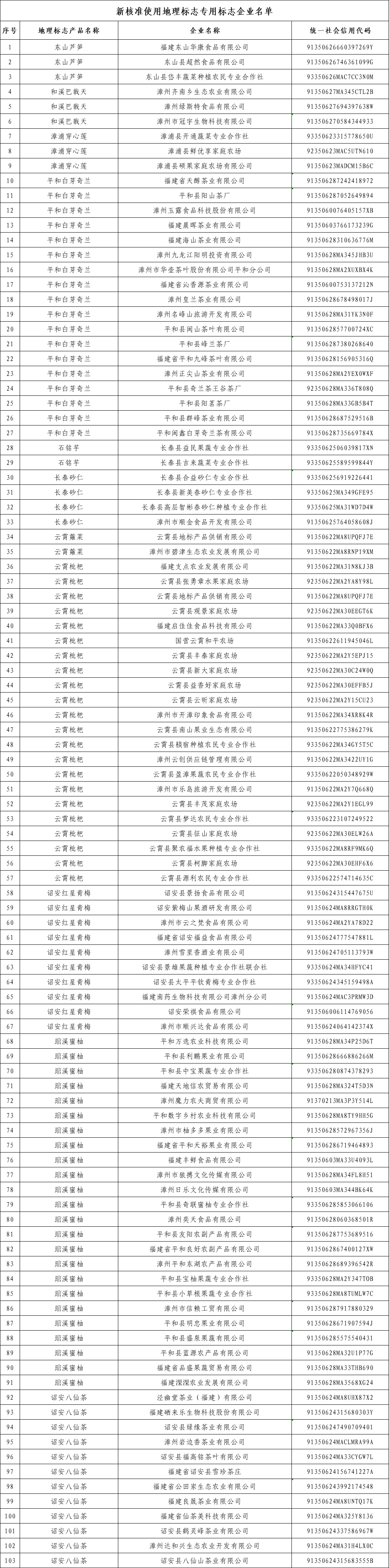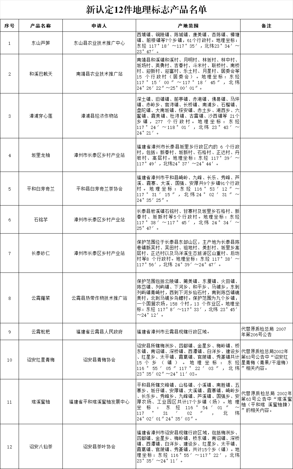 近日,国家知识产权局发布第640号公告和第642号公告,认定漳州市12件农产品为地理标志产品,并核准生产相关产品的“福建东山华康食品有限公司”等103家企业使用地理标志专用标志,标志着漳州全面完成农产品地理标志转换工作。