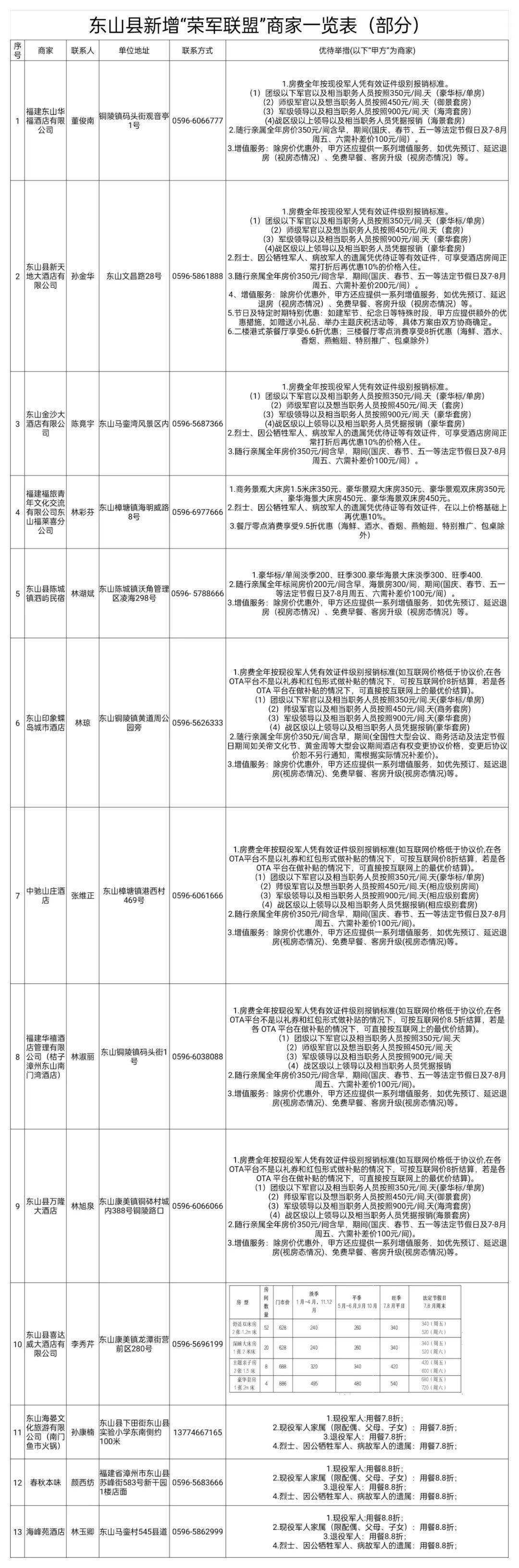 从首批单位签约到突破300家规模,东山县“荣军联盟”的扩容之路,也是社会化拥军从“点上探索”到“体系化推进”的升级之路。县双拥办同步推进军属证首发、现役军人父母养老保障等创新举措,300家联盟单位则成为政策落地的“毛细血管”——既让军人军属享受到看得见的实惠,也让拥军单位收获社会口碑,形成“尊崇军人”与“企业发展”的双赢格局。 “300家不是终点,而是新起点。”东山县双拥办负责人表示,未来将持续拓展优待场景,让“荣军联盟”的每一家单位都成为英雄岛的“拥军名片”,让军人军属的获得感在300家乃至更多社会力量的共同参与中愈发浓厚。 东山县新增 “荣军联盟”商家一览表(部分)