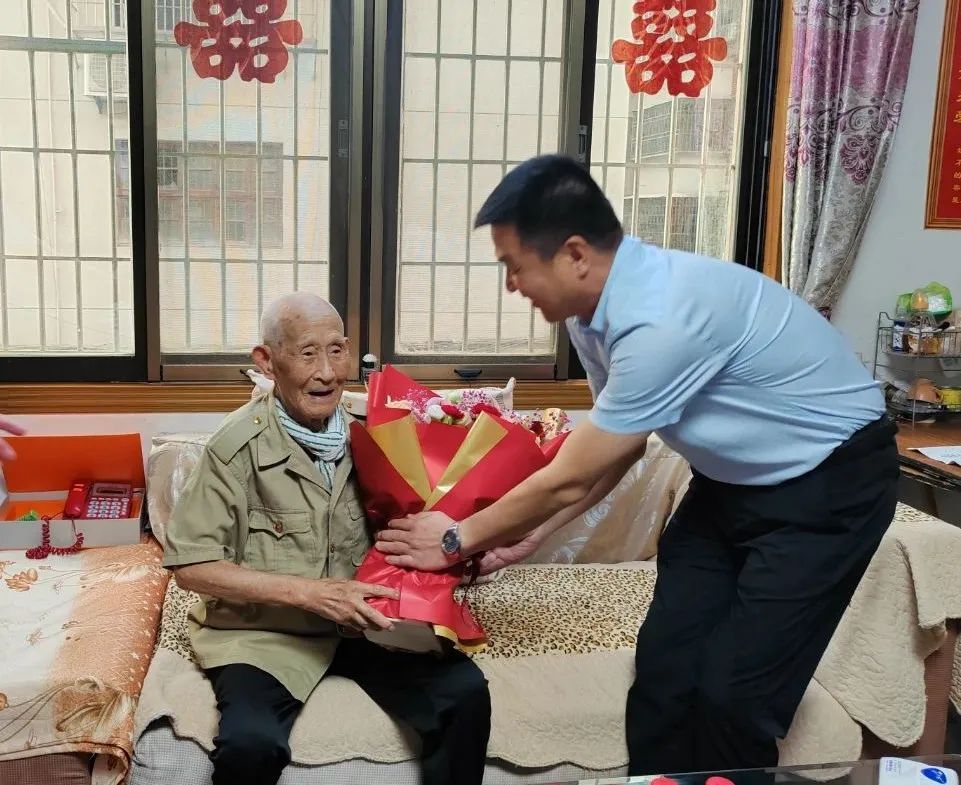 100岁抗战老兵王庆仙 在抗战老兵家中,慰问组与老兵亲切交谈,详细询问老兵的身体状况和生活情况,并献上鲜花,向他们致以崇高的敬意和诚挚的祝福。大家认真聆听老兵讲述那一段段战火纷飞的抗战故事。