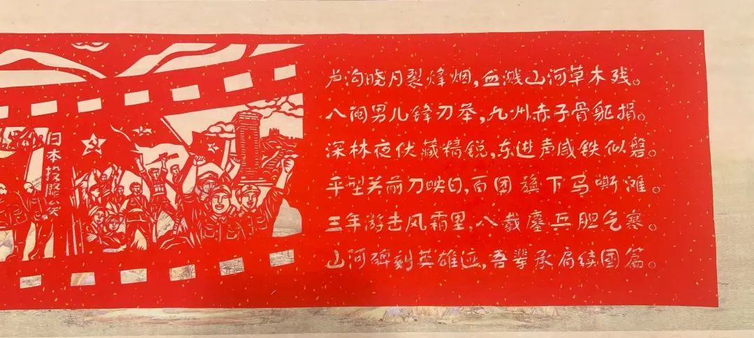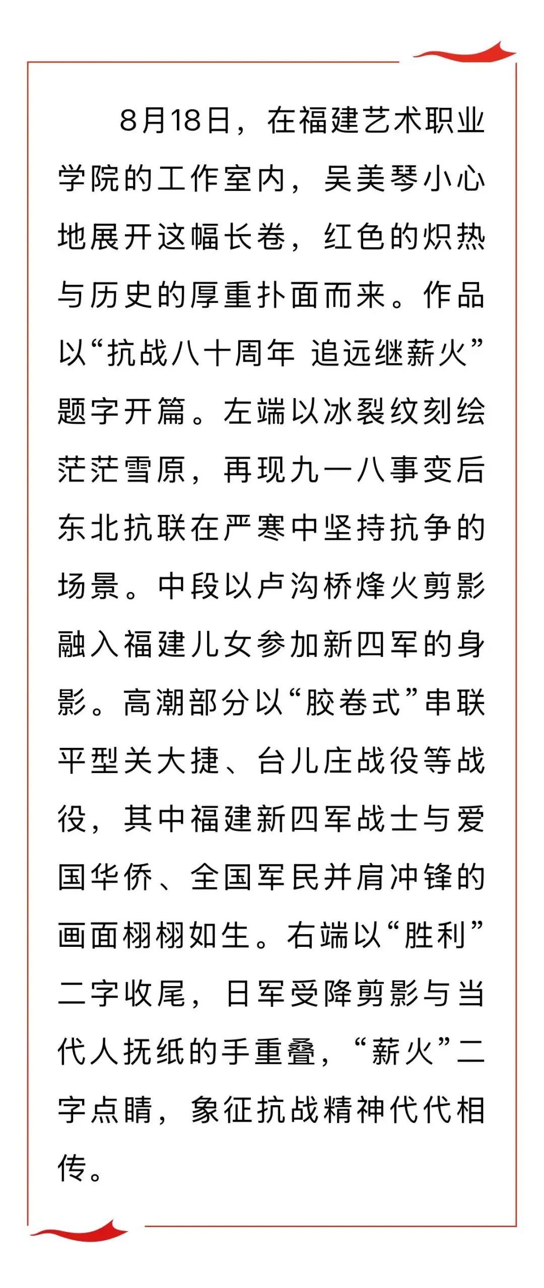 近日,由省剪纸协会会员、福州闽侯侯官剪纸工作室创办人吴美琴创作的10米抗战主题剪纸长卷完成。这幅以红纸为载体,融合“电影故事放映式”手法完整铺展14年抗战脉络的作品,彰显非遗创新的同时镌刻着家国情怀。