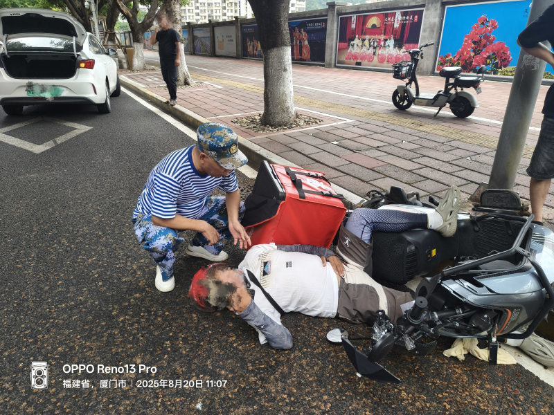 厦门:外卖小哥倒地,七旬老兵出手相助