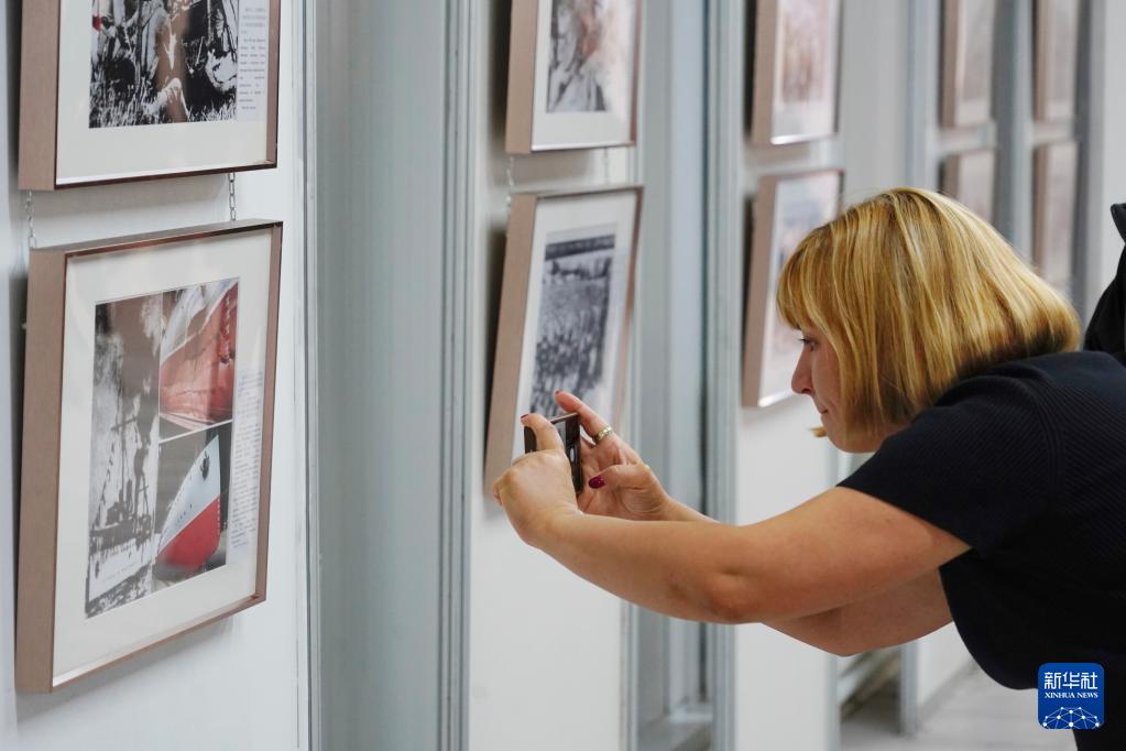 8月28日,在俄罗斯圣彼得堡,一名女子参观纪念中国人民抗日战争暨世界反法西斯战争胜利80周年图片展。