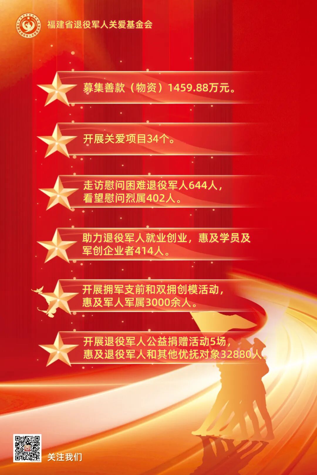 一个个关爱项目落地见效,一场场关爱活动成功举行,一次次慈善捐赠爱心行动,一张张温情瞬间映入眼前,见证了关爱行动温暖时刻,汇聚着社会各界的涓涓爱心。 爱始于心,善始于行。2023年9月20日,在省退役军人事务厅党组精心指导下,福建省退役军人关爱基金会正式成立,2年来,基金会始终不忘初心使命,凝聚爱心力量,传递党和政府的关怀,传送企业和社会组织的爱心,让退役军人和其他优抚对象获得感、荣誉感、幸福感成色更足,有力有效推动我省退役军人服务保障工作高质量发展。 基金会成立以来,始终秉持“服务宗旨、尊崇关爱”的理念,致力于搭建政府与退役军人之间的桥梁,在解困帮扶、助力就业创业、拥军支前、思政引领、宣传研讨等项目方面探索实践,着力解决退役军人和其他优抚对象急难愁盼问题。
