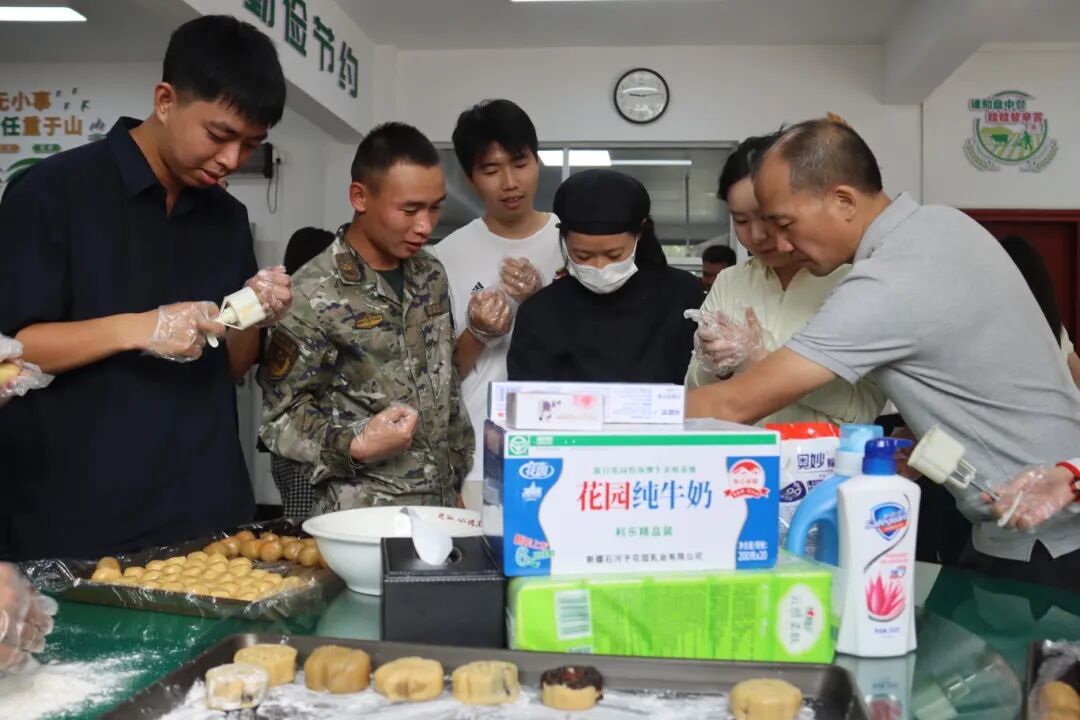 活动现场氛围浓厚,众人先在打卡墙贴满对祖国的祝福卡片,寄托家国情怀;随后,大家都沉浸在制作月饼的乐趣中,笑容格外灿烂。营区训练场上,“打靶”“投掷手榴弹”“投壶”“夹玻璃珠”等趣味游戏接连开展,官兵与参与者组队协作,欢笑中增进情谊。最终,博饼环节以清脆骰子声与欢快笑声,将节日氛围推向高潮。