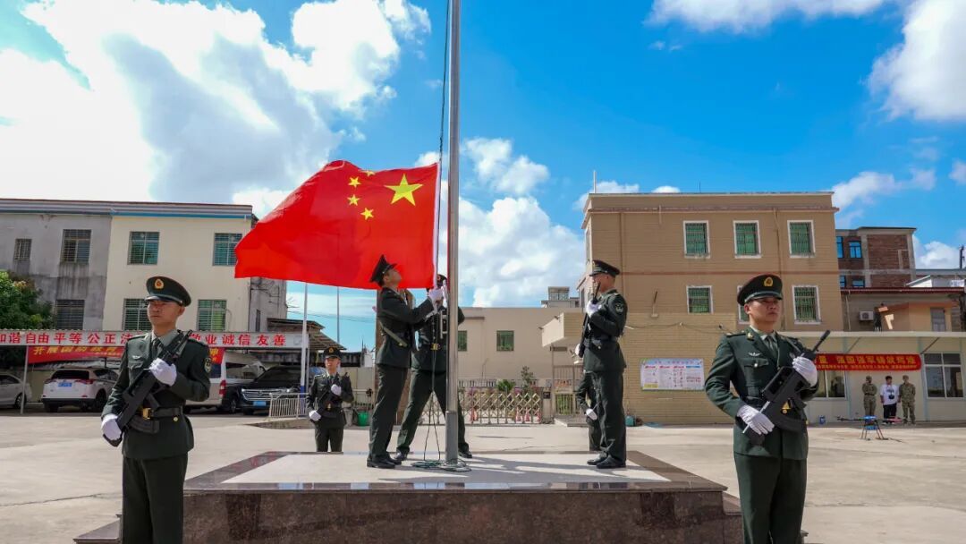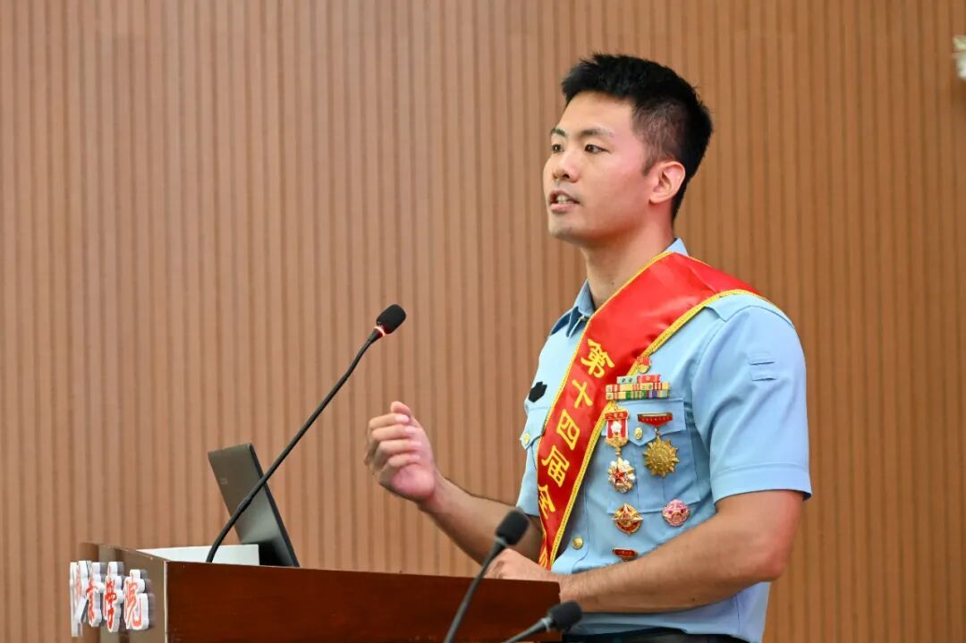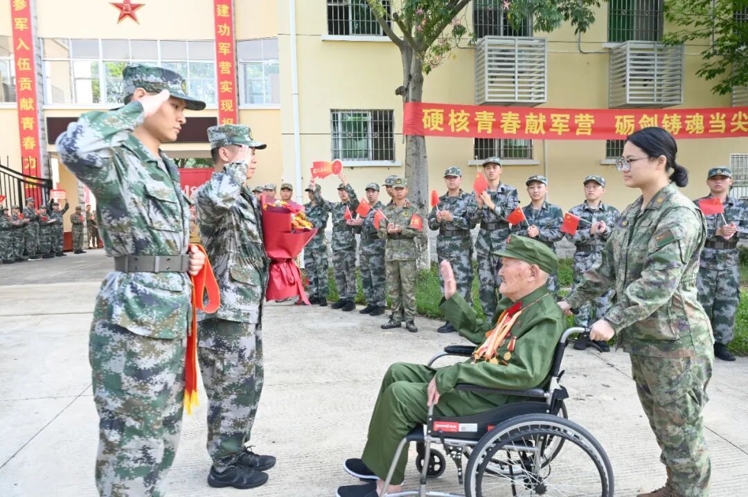 退役军人蔡泽恩带领全体同学面向国旗宣誓:“愿以吾辈之青春,捍卫盛世之中华”,铿锵誓言激发浓浓爱国情。