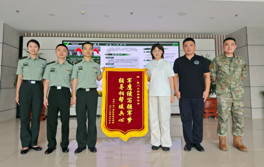 近日 厦门大学军鹰协会 收到一份特殊的“礼物” ——来自驻厦某部赠送的一面锦旗 锦旗上写着 “军鹰续写强军梦,辅导相帮暖兵心” 十四个大字 这不仅是对协会志愿服务的高度赞誉 更是军民同心、共筑强军梦的生动见证