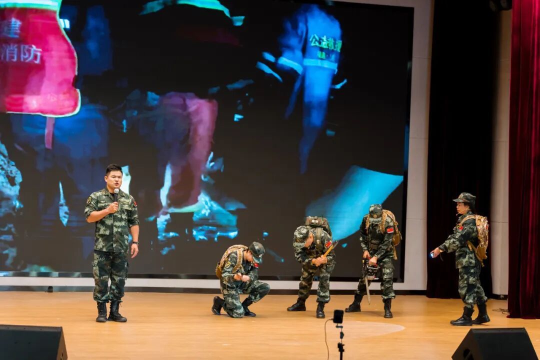 全国“最美退役军人”、福建省“最美退役军人”、福州市鼓楼区三坊七巷消防救援站副站长张天水作宣讲 宣讲会上通过情景模拟,现场还原客运服务场景,生动展现了中国铁路南昌局集团有限公司福州车站客运车间助理工程师马燕妮在平凡岗位上坚守军人本色、守护旅客出行安全的点滴事迹;再现龙岩上杭县古田军号公益救援突击队队长凌徵鹏和他的队员们不畏艰险、冲锋在前,守护人民群众生命财产安全的动人画面。