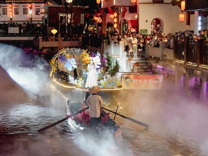 漳州龙海后港古街以“科技光影+非遗演艺”打造行浸式夜游新体验。核心IP《后港年华》通过水幕喷泉、3D墙体秀、光影电影《海上明月》等数字技术,再现月港历史风华,形成“夜游+影视”联动场景。同时,夜间非遗剧场常态化展演芗剧、弄虎等技艺,让游客在科技与文化的交融中,感受古今对话的闽式夜生活。