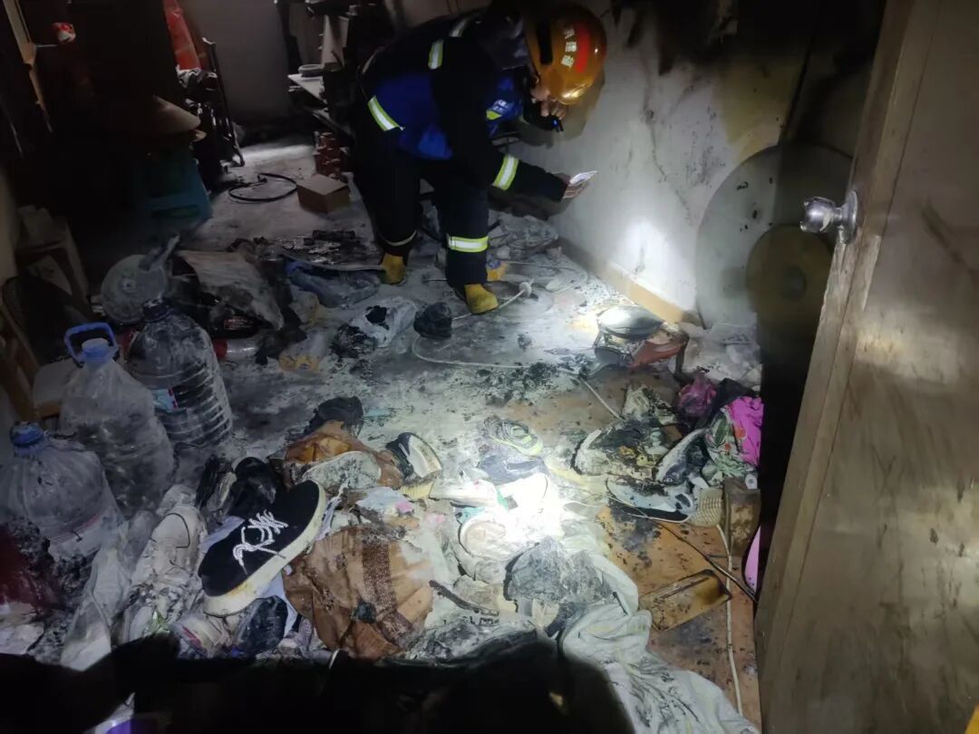 “当时屋内火势已起,浓烟滚滚,连门口的人影都看不清。”曾阳生回忆。他立即使用灭火器对准火源喷射,但由于室内堆积较多棉花与杂物,两瓶灭火器用完后火势仍未完全控制。顾不上脚部受伤未愈,他迅速转身下楼,向邻近商铺紧急借用两瓶灭火器,再次逆行进入火场扑救,最终成功将明火彻底扑灭。待消防人员抵达时,现场已无复燃可能,火灾未造成人员伤亡。后经核实,起火原因为室内用电插座故障。