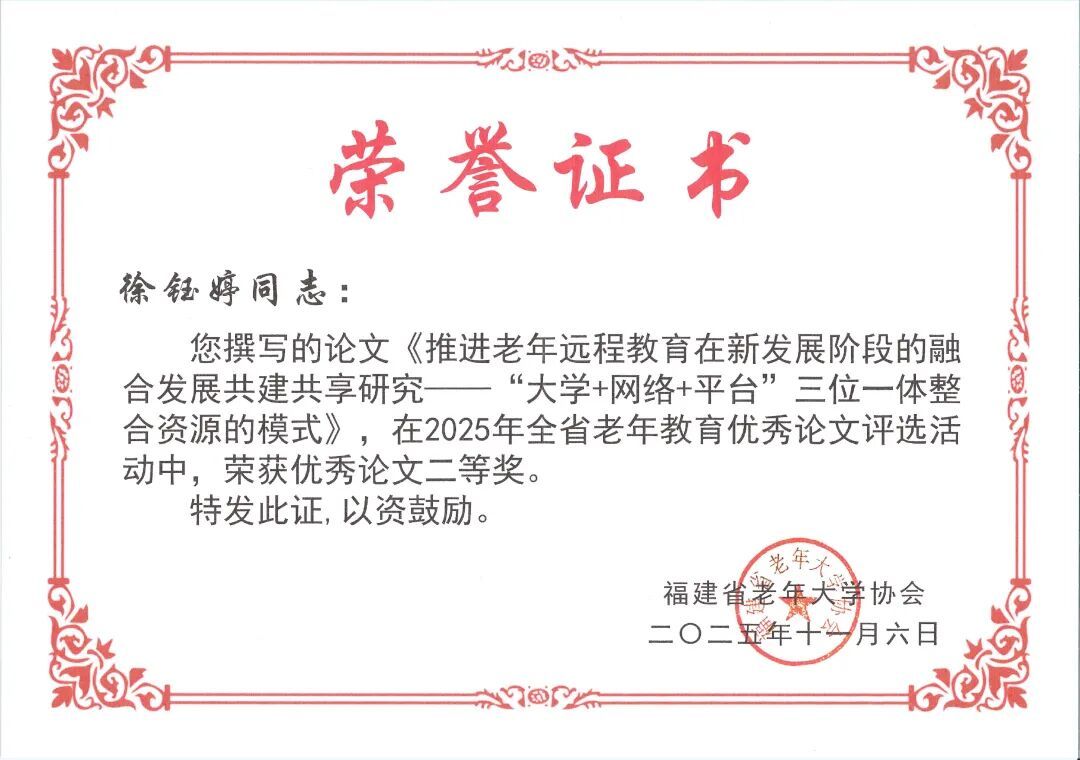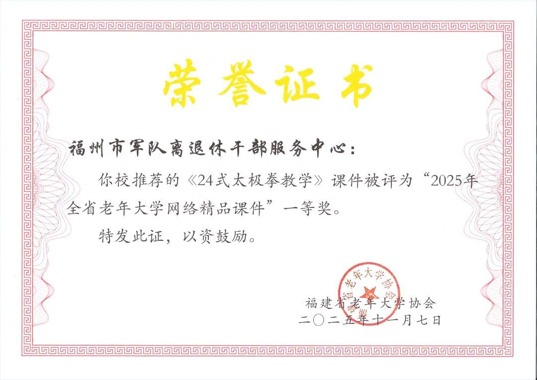 近日,全省老年教育工作会议在南平召开,表彰2025年全省老年教育优秀成果。福州市军休老年大学选送的《24式太极拳教学》荣获“2025年全省老年大学网络精品课件”一等奖;军休老年大学工作人员徐钰婷撰写的论文《推进老年远程教育在新发展阶段的融合发展共建共享研究——“大学+网络+平台”三位一体整合资源的模式》获评“2025年全省老年教育优秀论文”二等奖。