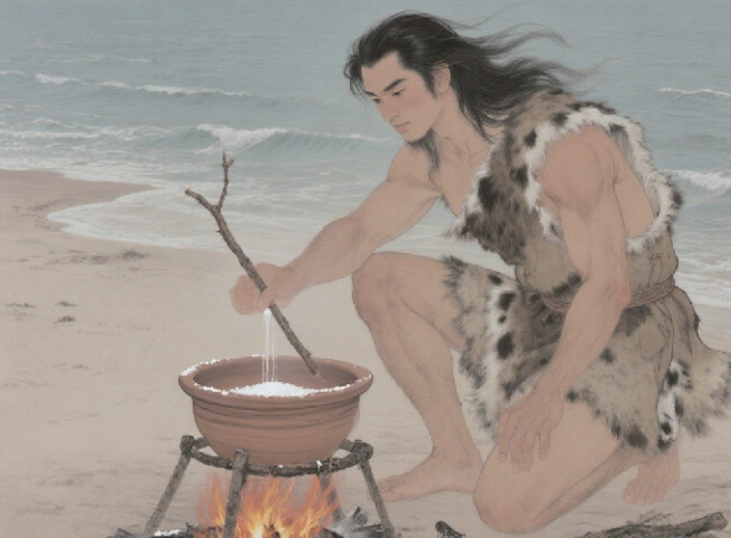 相传远古时候,在山东半岛南岸胶州湾一带,部落首领叫夙沙,他聪明能干臂力过人,善使一条用绳子结的网,每次外出打猎,都能捕获很多的禽、兽、鱼。 有一天夙沙在海边煮鱼吃,他和往常一样提着陶罐从海里打半罐水回来,刚放在火上煮,突然一头大野猪从眼前飞奔而过,夙沙见了岂能放过,拔腿就追,等他扛着猎物回来,发现罐里的水已经熬干了,罐底留下了一层白白的细末。 他用手指沾点放到嘴里尝尝,味道又咸又鲜。夙沙用它就着烤熟的野猪肉吃起来,味道好极了。 那白白的细末便是从海水中熬出来的盐:这一发现为先民们提供了重要的调味品,更开启了海水制盐的辉煌篇章。 |