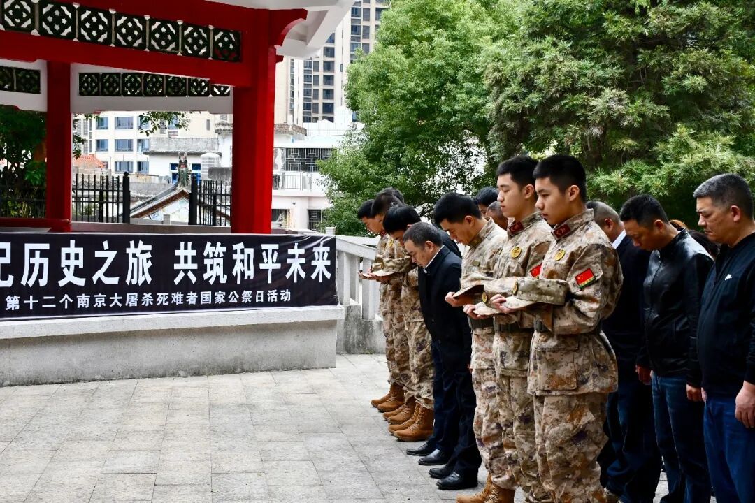 仪式结束后,全体人员参观纪念馆英烈事迹陈列室,集中观看《南京大屠杀史实纪录片》片段,真实历史画面震撼人心,进一步坚定铭记历史、反对战争的信念。大家还在“和平寄语”留言区提笔写下对历史的敬畏与和平的期许,饱含传承红色基因、奋进新时代的担当。 此次活动以庄重简洁的形式,开展了一场深刻的爱国主义教育和革命传统教育。大家纷纷表示,将铭记历史、勇担使命,把哀思转化为奋进力量,为守护和平、建设家乡不懈努力。 漳州市 12月13日上午,漳州市云霄县举行国家公祭日纪念活动,云霄县退役军人事务局全体干部职工、县人武部代表、各乡镇退役军人服务站站长及退役军人代表齐聚献宝山烈士陵园,共同参与此次纪念活动。