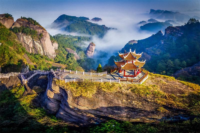 冠豸山景区位于龙岩连城,是国家5A级旅游景区与龙岩世界地质公园核心区。景区以“客家神山”著称,拥有“生命之根”“生命之门”等丹霞奇观,融合山湖林泉等多元景观。九龙湖是景区的核心组成部分。它并非天然湖泊,而是1999年通过筑坝蓄水形成的人工湖,水域面积达1200余亩。最大的特色在于丹霞地貌与湖光山色的完美融合,形成了“湖中有山,山中有洞,洞中有水”的独特景观。湖区内水道蜿蜒,如水上迷宫,拥有“九龙献瑞”“大龙潭瀑布”等自然景点。主要的游览方式是乘坐画舫游船或竹筏穿行于碧水丹山之间,欣赏沿途的崖壁和石柏植被。