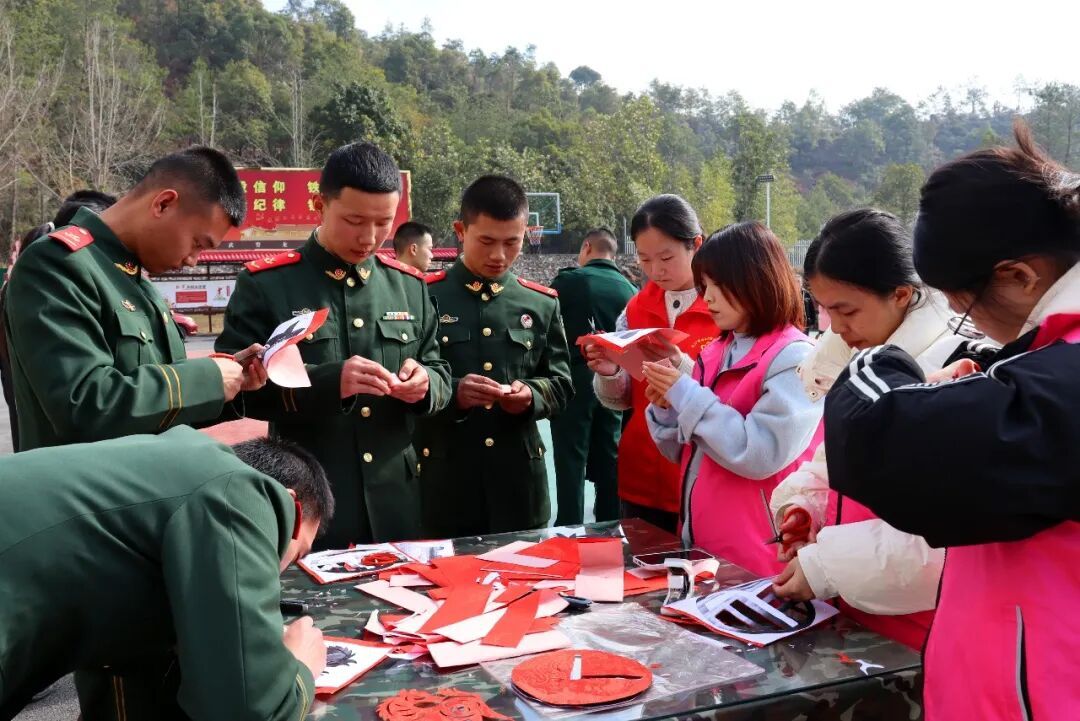 书法家们还耐心传授握笔姿势、运笔技巧等书法基础要领,细致解答官兵疑问。不少年轻官兵主动执笔,在名家指导下体验书法魅力。另一边,剪纸老师讲解完剪纸的历史渊源与基本技法后,从折纸、起剪到收尾逐一演示。官兵们积极参与、相互协作,红纸翻飞间,一幅幅精巧的剪纸作品相继成形。
