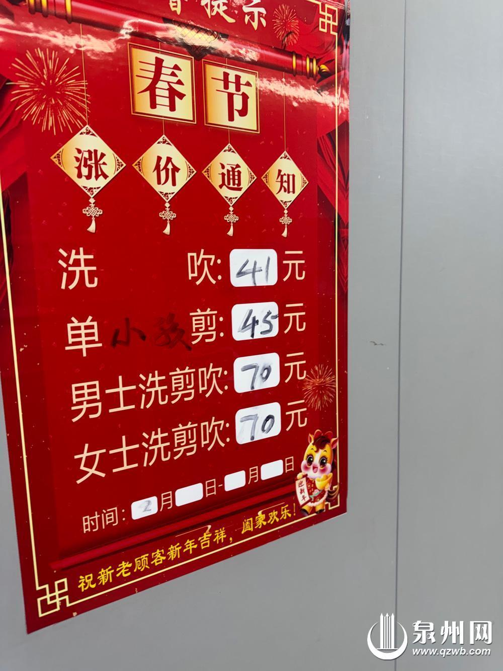 服务行业节前价格普涨引关注 部门:应明码标价,保障消费者知情权和选择权 泉州网2月10日讯(融媒体记者 廖培煌 杨泳红 宋万春 文/图)春节临近,理发、洗车、家政等服务行业迎来消费旺季,部分商家依据市场情况上调服务价格,此现象成为年关消费热点话题。在市场供需变化下,价格合理浮动本是正常市场调节,但若缺乏透明度与合理性,可能影响消费信任。 泉州市市场监督管理局重申,经营者应严格落实明码标价规定,依法保障消费者知情权和选择权。广大群众若遇价格纠纷或发现价格违法行为,可拨打“12315”或向属地市场监管部门投诉举报。 走访 多行业普遍涨价 个别涨幅翻倍 连日来,记者走访发现,临近春节,多个行业服务价格出现不同程度上涨,个别行业涨幅相对较大,甚至翻倍。
