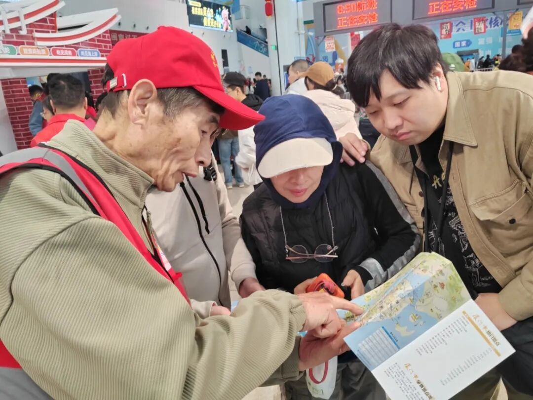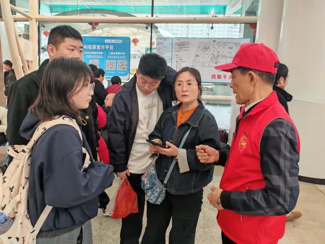 在熙熙攘攘的码头大厅 老兵们化身“活地图”和“贴心人” 他们有的为游客指引方向、解答问询 有的手把手地教旅客使用自助设备 解决购票、取票难题 还有的热情为游客规划出行路线