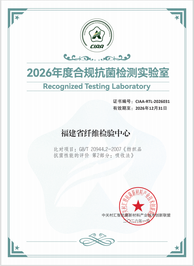 近日,中关村汇智抗菌新材料产业技术创新联盟(CIAA)正式公布“2026年度合规抗菌检测实验室”名录,福建省纤维检验中心凭借出色的能力再次成功入选。 自2023年首次参与CIAA组织的抗菌性能测试比对活动以来,福建省纤检中心连续三届取得“满意”的比对结果,检验检测能力水平稳定保持在联盟推荐的合规实验室前列。中心微生物实验室历经二十余年稳定运行,具备国际一流的检验设备和完善的检测体系,且具备抗菌产品检测的CMA及CNAS双重资质,检测能力全面覆盖纺织品、纸制品、一次性卫生用品、鞋类及防护用品等多个领域。 随着时代的发展,市场对抗菌产品的质量与安全性提出了更高要求。未来中心将持续加强微生物实验室的体系建设与管理,持续提升抗菌性能检验的技术水平,为相关企业的产品安全与质量管控提供坚实可靠的技术支撑。