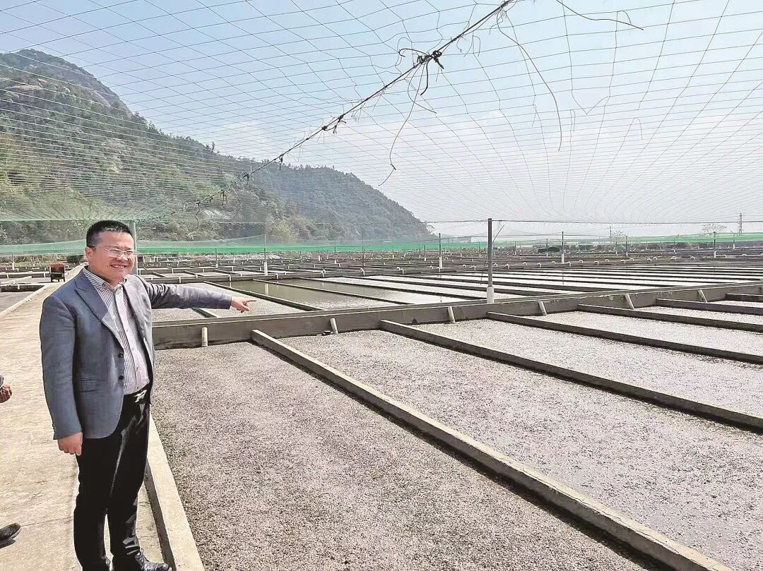 周洪磊介绍自己公司人工养殖的一块块沙蚕“田”。 “沙蚕被誉为‘海里的冬虫夏草’,既是‘万能鱼饵’,又是饕餮美食,备受青睐。”洋泽科技总经理周洪磊说,公司因养殖沙蚕而创立,2018年至今,已发展成集良种开发、生态养殖、水产品加工销售和生态修复于一体的国家高新技术企业、农业产业化省级重点龙头企业,拥有“罗源湾”“洋泽饵业”等知名品牌。 退役军人周洪磊今年42岁,现为罗源县政协常委、罗源县青年创业促进会会长、罗源县鲍鱼协会会长。 “从部队退役后,我一心想干一番事业。”服役两年后,周洪磊于2004年从部队光荣退役,只身前往厦门,开启创业路。经过市场调研,他发现“钓娱经济”在厦门发展迅猛,便将创业领域锁定在渔具行业。周洪磊抓住机遇,代理国内外名牌渔具,并于2010年合伙创办了主营渔具批发的厦门西岩商贸有限公司。当年,公司实现营业额2000多万元,他获得人生“第一桶金”。 在经营渔具的过程中,周洪磊敏锐地发现,“万能钓饵”沙蚕在钓鱼旺季供不应求,市场潜力巨大,特别是夏季,基本断货。 为此,2015年,周洪磊毅然回到家乡罗源县开辟创业新路,带领战友及村民创立沙蚕专业养殖合作社。之后,他到日本、韩国取经,建起沙蚕养殖基地。基地模拟沙蚕的野外生长环境,用海泥建造“标准田”,设计了管道,按照海水涨退潮规律冲刷和供食。