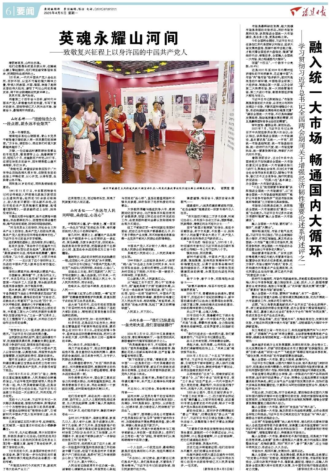 省烈保中心红领巾英烈讲解员在八闽英烈廉政事迹陈列馆为群众讲解英烈故事。 谢赟星 摄 福建福州,八闽英烈廉政事迹陈列馆,“红色金融家”高捷成的一封家书格外引人注目。 “所欠挂百川银庄二万多元的债,时刻记念在心,本利至今当在三万余。国家得救,民族得存,清债还利当不短欠分文……” 坚守“救国才能顾家”的信念,虽经手巨额资金,却宁欠私款,不贪墨一分,始终将个人利益置于革命大局之下,共产党人的廉洁本色和浩然正气跃然纸上。 “学习先烈 艰苦创业”。1995年1月,时任福州市委书记习近平同志在《福州革命烈士传略》一书上写下这样八个字。 慎终如始,则无败事。 新时代新征程,中国共产党人戒骄戒躁,慎独慎微,坚持用改革精神和严的标准管党治党,以勇于自我革命精神打造和锤炼自己,不断清除一切侵蚀党的健康肌体的病毒,永葆党的先进性和纯洁性。 敢于斗争,善于斗争,无惧艰险永远奋斗—— “缺氧不缺精神、艰苦不怕吃苦、海拔高境界更高”。 2006年7月,青藏铁路全线通车。雪域苍穹下,历经近半个世纪的拼搏奋斗,新中国的建设者们以血肉之躯勇闯生命极限、力破万重之障,如铁的雄关在如铁的意志、如铁的精神面前化为坦途。 关山万千重,山高人为峰。 20年后的今天,雅鲁藏布江下游水电工程大幕拉开,新一代中国共产党人致敬“天路”忠魂,勇攀科技高峰,全力推动能源绿色低碳转型,在世界屋脊上创造新的奇迹。 “我们已经走出一条光明大道,我们要继续前行。”习近平总书记激励全党。 战斗正未有穷期,不待扬鞭自奋蹄。 燕赵大地,长风浩荡,山河形胜。昔日英烈们奉献牺牲的热土上,“未来之城”雄安拔节生长。 2026年3月23日,“十五五”开局的关键节点,习近平总书记赴河北雄安新区考察,引领党员干部牢固树立、深入践行正确政绩观,“一马当先、蹄疾步稳地干事创业,共同创造雄安美好未来”。 从西柏坡的“出发”令,到雄安新区的“建设”令,从“两个务必”的郑重号召,到“三个务必”的庄严宣示,一代代中国共产党人前赴后继,勇毅笃行,矢志创造无愧于时代、无愧于人民、无愧于历史的实绩。 1000余公里外,西北古城甘肃会宁,“中国工农红军第一、二、四方面军会师纪念塔”巍然矗立。三塔环抱的雄姿,述说着90年前名垂青史的不朽功勋,昭示了中国共产党永葆生机的精神密码。 新的长征路上,面对许多仍需跨越的“雪山”“草地”,仍需征服的“娄山关”“腊子口”,习近平总书记引领全党凝心聚力,矢志奋斗,依靠顽强斗争打开事业发展新天地—— “只要我们保持坚定理想信念和坚强革命意志,就能把一个个坎都迈过去,什么陷阱啊,什么围追堵截啊,什么封锁线啊,把它们通通抛在身后!” 山河多锦绣,英魂永不朽。 历史已经并将继续证明:他们的信仰永不磨灭,他们的事业永世长存! 先辈开辟的光明大道正在通向中华民族伟大复兴的光辉彼岸。以习近平同志为核心的党中央团结带领亿万人民昂首阔步、一往无前。 (新华社北京4月5日电) |
