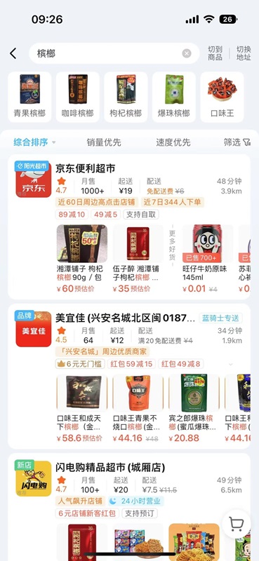 三明一学校附近,店铺上方设置了醒目的槟榔广告 电商平台鲜有设限 记者也查看了多个电商平台,发现众多槟榔产品琳瑯满目,青果槟榔、咖啡槟榔、爆珠槟榔、枸杞槟榔、酱香槟榔等品类齐全,只需下单支付便可快速送达,对买家是否成年并无特殊限制。 在美团外卖定位福州,除了门店密集的万嘉便利、六意便利、京东便利店等有槟榔在售,还有一刻便利、7+便利店、便利先生、鑫万超文体便利(晨光文具)、佳盛文具便利、米熊仓鼠超市、奈斯优选生活超市等均有售卖,买家可根据地域、喜好随时下单。将定位调整为莆田、南平、宁德、三明、泉州等地,也有众多店家提供槟榔外卖。 除了美团,记者也尝试了永辉、朴朴、沃尔玛、大润发等线上平台,未见槟榔销售。不过,饿了么、多多买菜、淘宝、京东、拼多多等电商平台大都货品齐全,有的可选择即时送货,有的只能次日自提。就连闲鱼也有槟榔可买。 槟榔在全省各地大行其道,唯有厦门较为特殊。在外卖平台定位厦门搜索槟榔时,出现的是“搜索结果为空”的提示。不过,这并不妨碍有心人从淘宝、京东等平台下单购买。