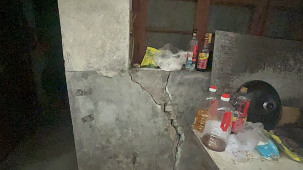 老旧房屋严重破损墙体开裂。(东南网记者 陈艳 摄) 老旧房屋现状堪忧 在江东路旁,杨玉清的家临街而立,背靠小山,位于坡路底部。房屋前低后高,设有两个店面,分别用于出租和自营补胎业务,均因地势原因低于街道平面。见到记者,杨玉清急切地指引记者前去查看房屋现状。 穿过店面是生活区,映入眼帘的是残破院子:地面裂缝纵横交错,墙面大面积脱落,厨房窗台处有一道一米多长的裂痕贯穿而过;屋顶多处水泥剥落,钢筋裸露在外,安全隐患重重。杨玉清指着头顶一处裸露出的钢筋道:“这里的水泥已经霉烂了,这块掉下来时正好砸在了我头上。” 上到二楼,头顶垂悬着的电线甚是醒目。三楼则是一家人的起居空间。其中一间已经空置,天花板上是肉眼可见的裂痕,绿色的苔藓顺着裂缝的中心向外蔓延。在夫妻二人的指引下,记者还见到了房屋墙体分离、开裂等情形。 杨家七口人,因房屋安全隐患,儿媳已携孙辈回娘家居住,大儿子也随同前往。谈及此,吴丽珍情绪激动,她坚信房屋的破损与江东路的路面整改工程密不可分。她指出,江东路的路面分别于2004年和2024年进行过路面改造,导致街道高于房屋60公分,雨水倒灌现象频发,加之施工震动,加速了房屋的老化与损坏。今年六月的一场持续降雨更是让一楼几乎被淹,严重影响了家庭的正常生活。