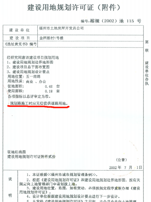 颖源大厦用地许可证上写明“应无偿提供道路用地”。(台江区自然资源和规划局供图) 堵点3:金尊名都小区围墙及活动平台怎么拆? 联发臻品小区北侧规划路的西头,是金尊名都小区用铁栏杆树起的围墙,栏杆围起的区域内建设了一个圆形的活动平台。这些设施的拆除成为联发臻品小区配套路建设的又一堵点。 台江区建设局市政科徐佳向记者表示,金尊名都小区围起的这部分区域占用了道路红线,由于历史遗留原因被一直占用,修路时居民不同意退让。“小区的图纸上都是有标注的,按理说修路时要无条件退让出来,我们在道路施工时可以一并拆除,并按照道路红线将小区围墙修建到位。业主什么都不用做,但他们仍然不乐意,导致道路这一端也无法修建。”徐佳说。 据了解,此处围墙和活动平台并不属于征迁范围,也就是未经正式认定的“违建”。然而,金尊名都小区的居民都认为该区域是小区的范围,不允许拆除。“居民们都比较激动,投诉件非常多,”孙朝丹告诉记者,“我们做了很多工作,暂时没什么进展。”